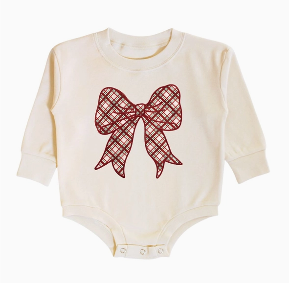 Christmas Plaid Bow Patch Long Sleeve Romper