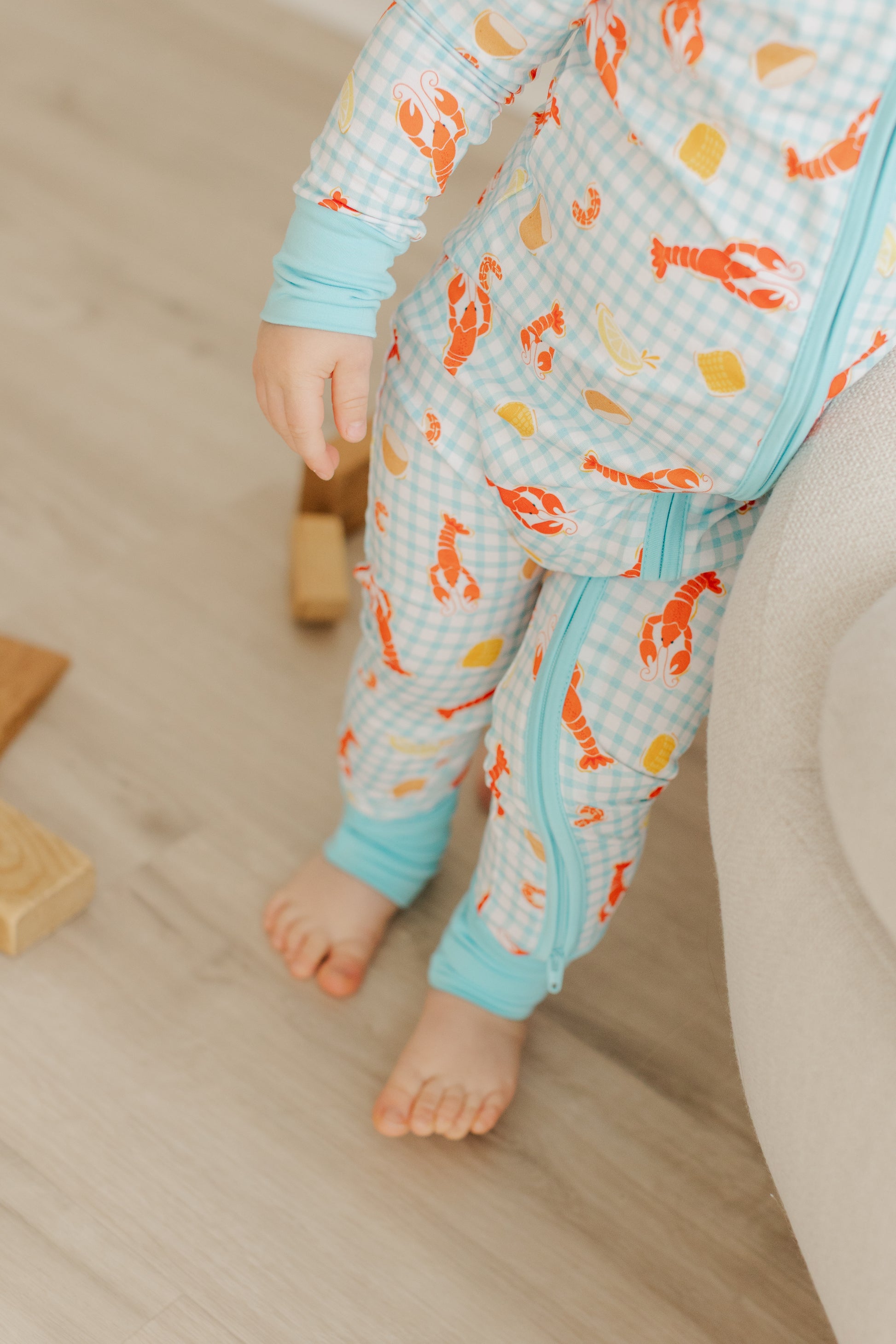 Soft bamboo pajamas designed for baby boys, featuring an adorable crawfish boil print. The zippered design makes diaper changes and bedtime routines effortless. Bamboo fabric is naturally hypoallergenic, breathable, and gentle on delicate skin, keeping your little one comfortable through the night. Perfect for cozy sleep and easy dressing.