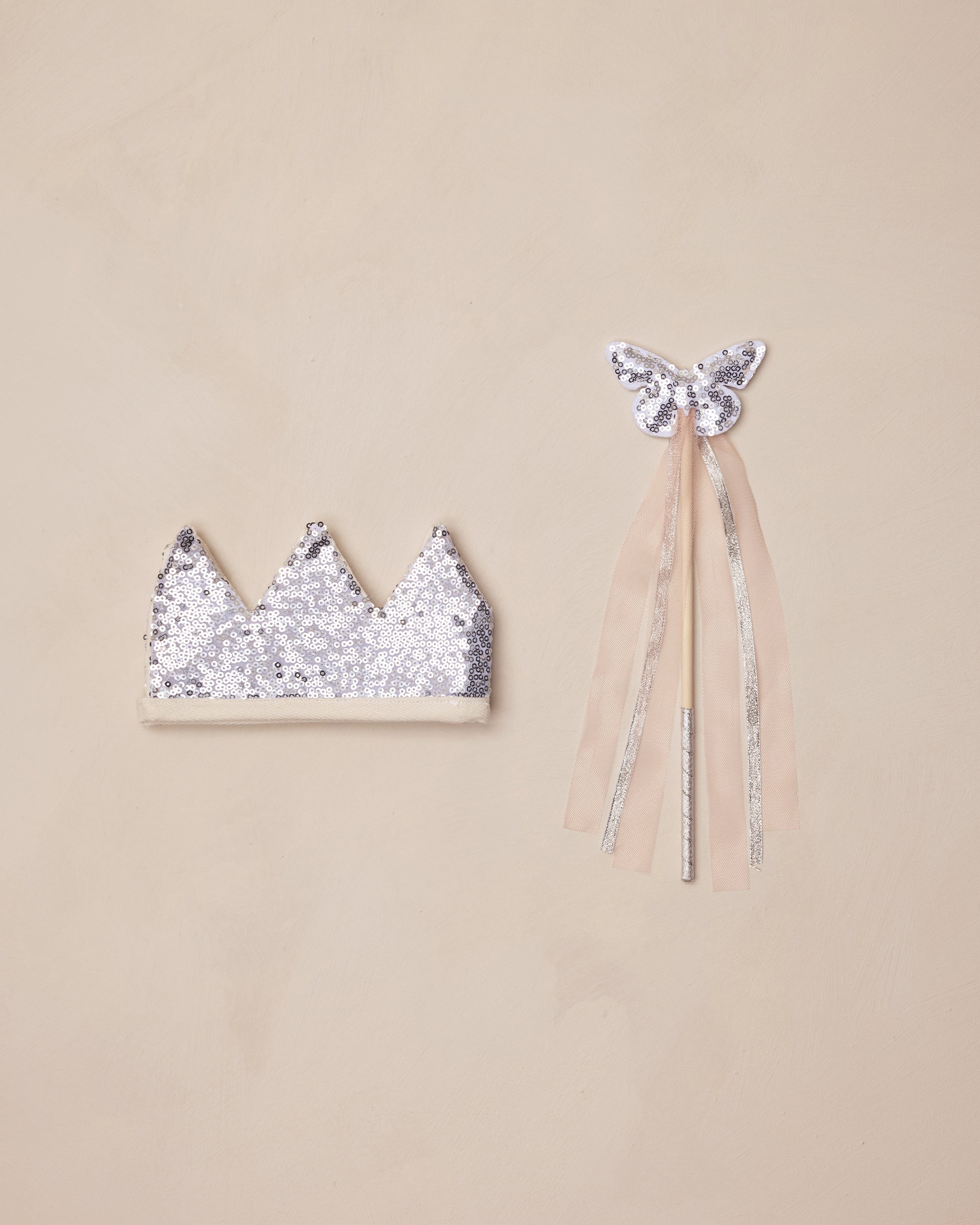 No dress-up look is complete without our sun crown ribboned headband and star wand—crafted from a wooden dowel and adorned with a tinkling bell and flowing tulle ribbon—perfect for every royal occasion.