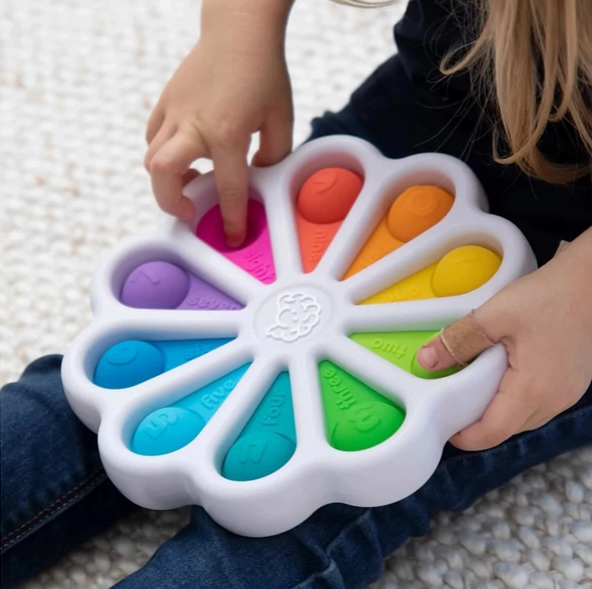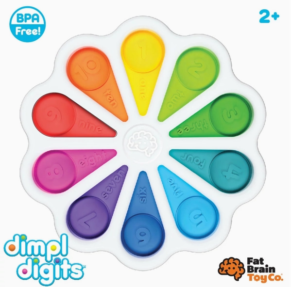 Touch, push, pop, and learn! Squishy, silicone bubbles captivate the fingers in a way that's impossible to put down while simultaneously opening a unique new avenue for learning. On one side, the bubbles are embossed with the numerals 1 through 10, each accompanied by its matching word in English. Flip it over and you'll find the words written in Spanish, plus dots to feel and count! Colorful, unique, and wonderfully tactile - Little fingers can't resist the number-learning delight of Dimpl Digits.