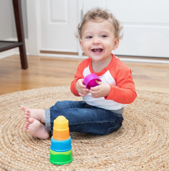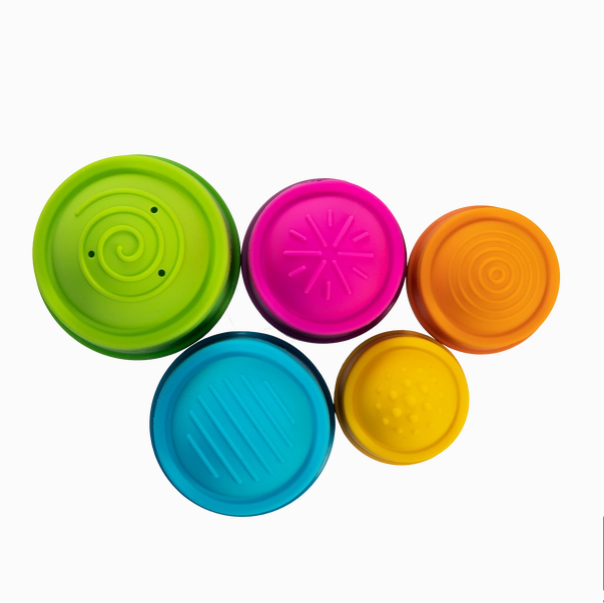 The top of each cup features a squishy silicone bubble embossed with a unique texture pattern. Little fingers will love to touch, push, and pop them again and again. Meanwhile, its unique stackability engages curious and growing minds while providing the hours of fun parents have come to expect from the entire line of Dimpl toys. Tactile fascination stacks up with Dimpl Stack!