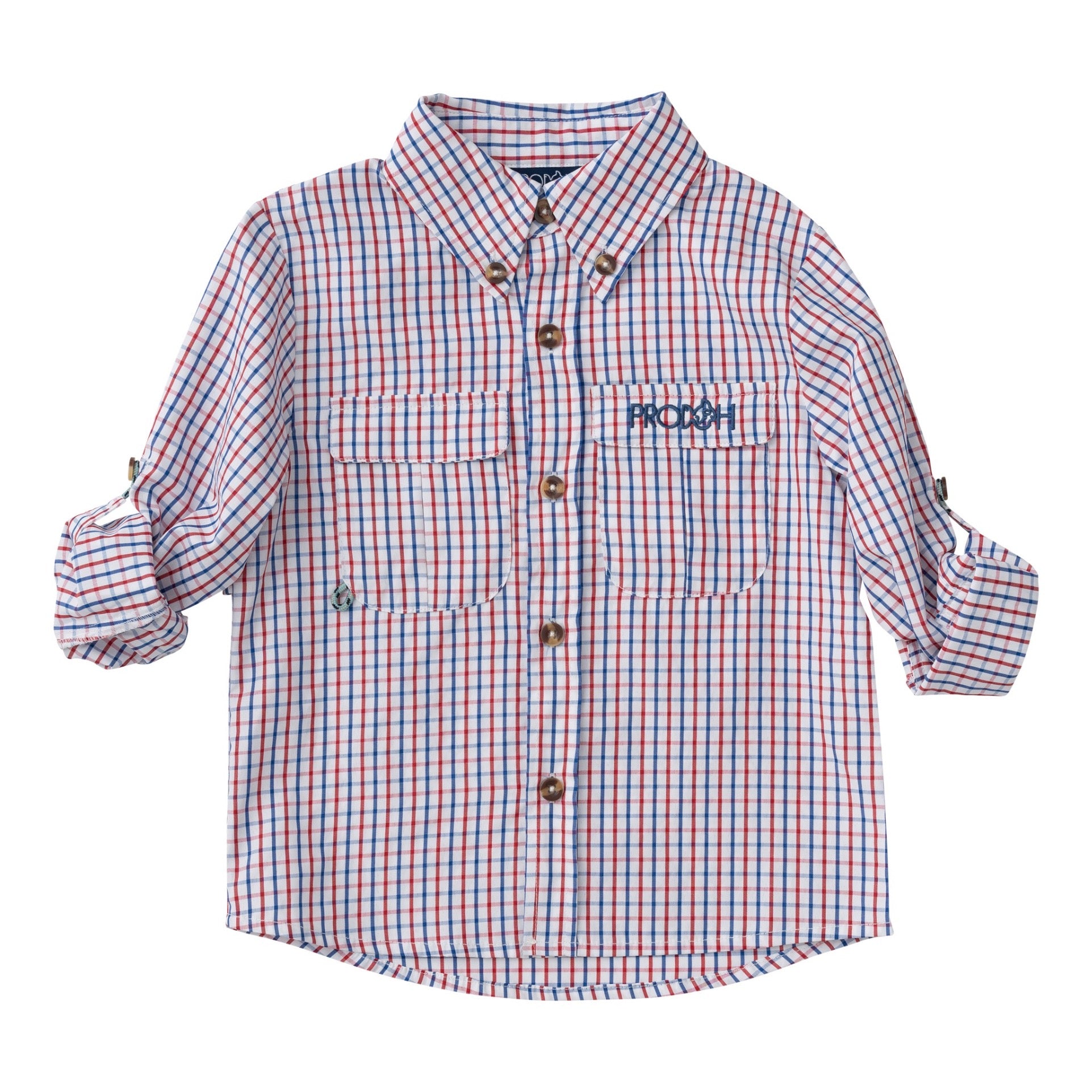 The FOUNDERS KIDS FISHING SHIRT is a great addition to your toddler's wardrobe. This long sleeve shirt features roll up sleeves for added versatility. Made with expert craftsmanship, it offers both style and functionality for your little one's outdoor adventures. Available in a bold red, white, and blue color scheme.