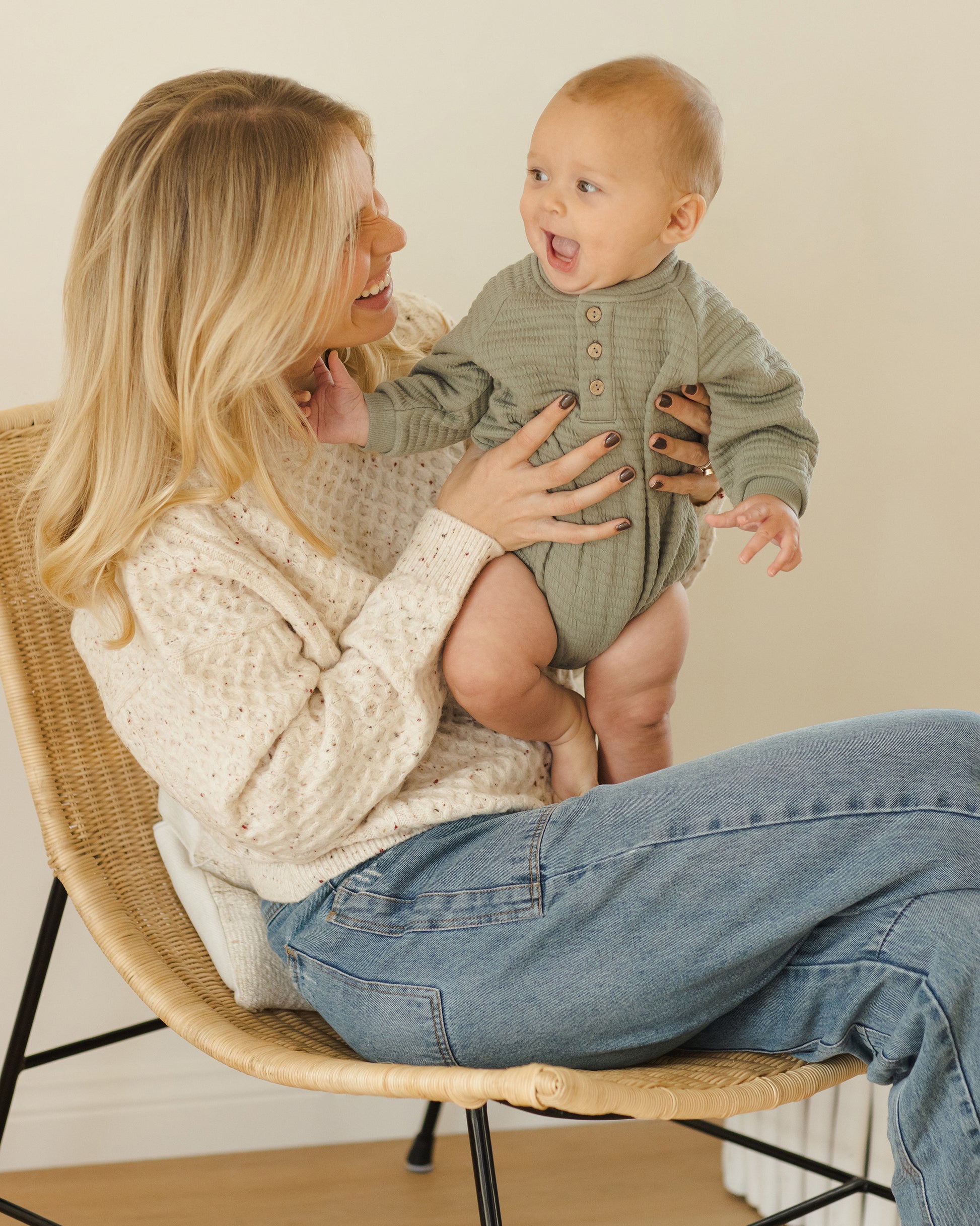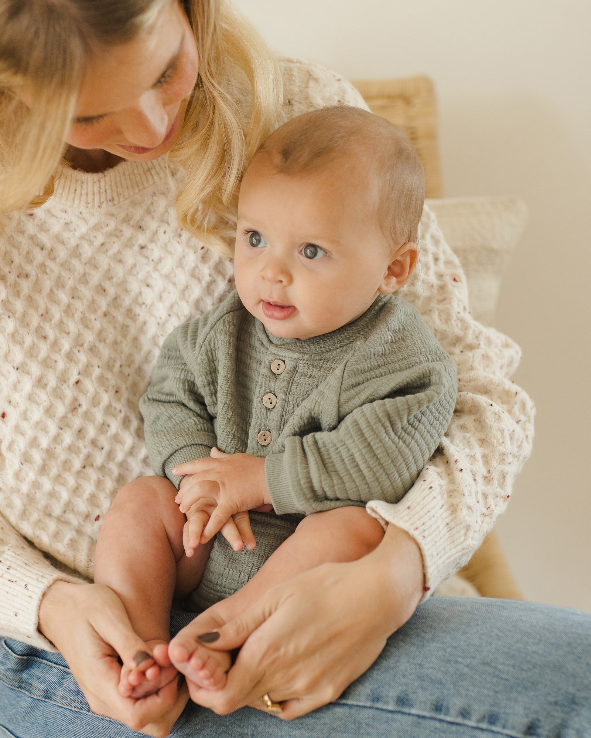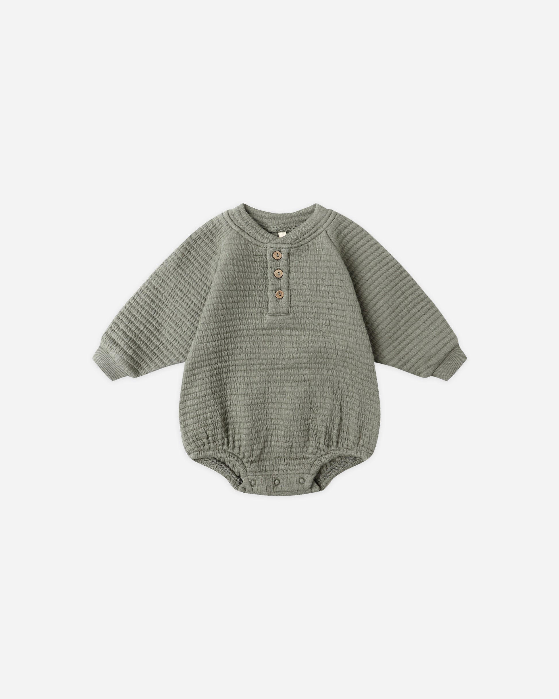 Longsleeve henley bubble romper made in soft and cozy quilted fabric. Elastic leg openings, as well bottom snap closures, ensure easy changing.