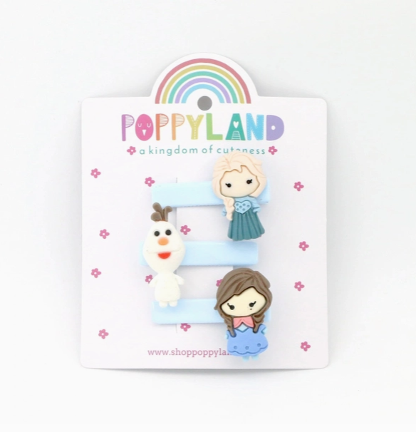 Our Ice Princess hair pin trio are great to wear all winter long and beyond! Featuring princess sisters and a snowman, these whimsical pins add a touch of magic to every hairstyle, making them fun for little girls. At Poppyland, a kingdom of cuteness, we pride ourselves on offering charming and high-quality accessories that delight our young customers. These hair pins are perfect for everyday wear or special occasions. Add an enchanting touch to your little one’s look with a set of Ice Princess Hair Pins today!