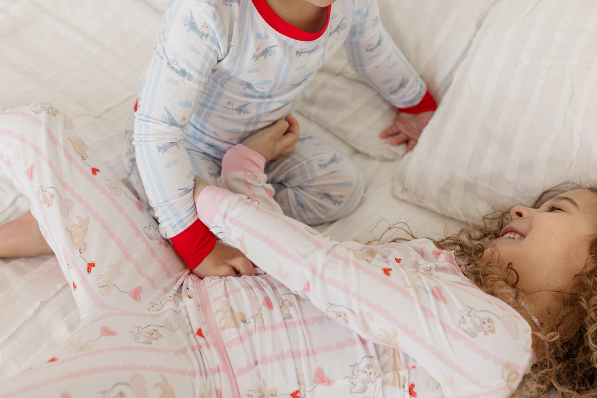 Love Is In The Air Jam Set features soft, breathable bamboo pajamas perfect for Valentine's Day and year-round comfort. Crafted from sustainable bamboo fabric, these pajamas offer gentle support for growing bodies while maintaining temperature regulation throughout the night. The charming Toast + Jams design brings playful style to bedtime routines. Ideal for children who appreciate quality sleepwear that combines durability with eco-conscious materials, these pajamas deliver both comfort and style that extends well beyond the holiday season.