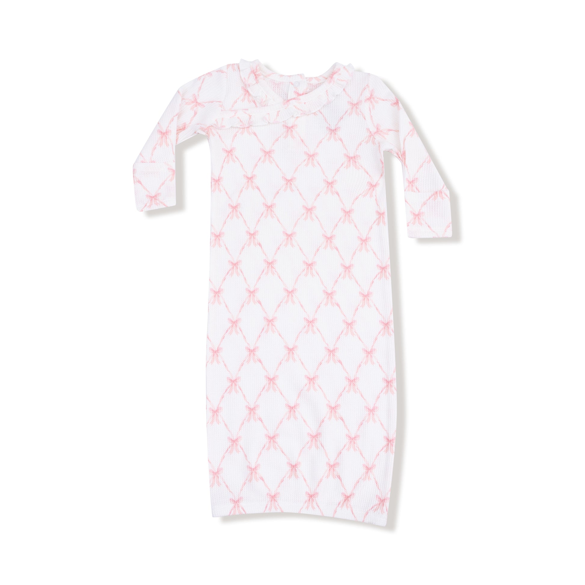 Wrap your little one in charm with the Ribbon Bow Trellis Kimono Gown. Featuring a delicate trellis pattern adorned with playful ribbon bows, this gown combines comfort and style effortlessly. Its soft fabric and easy kimono design make dressing a breeze, perfect for cozy days and sweet dreams.