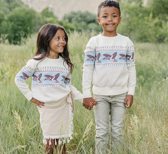 A timeless heirloom piece with a touch of the great outdoors. This cozy knit sweater features a classic cream base with a soft blue fair isle pattern showcasing flying mallards. Perfect for cool days, family photoshoots, or holiday gatherings, it's made for comfort and style that lasts season after season.