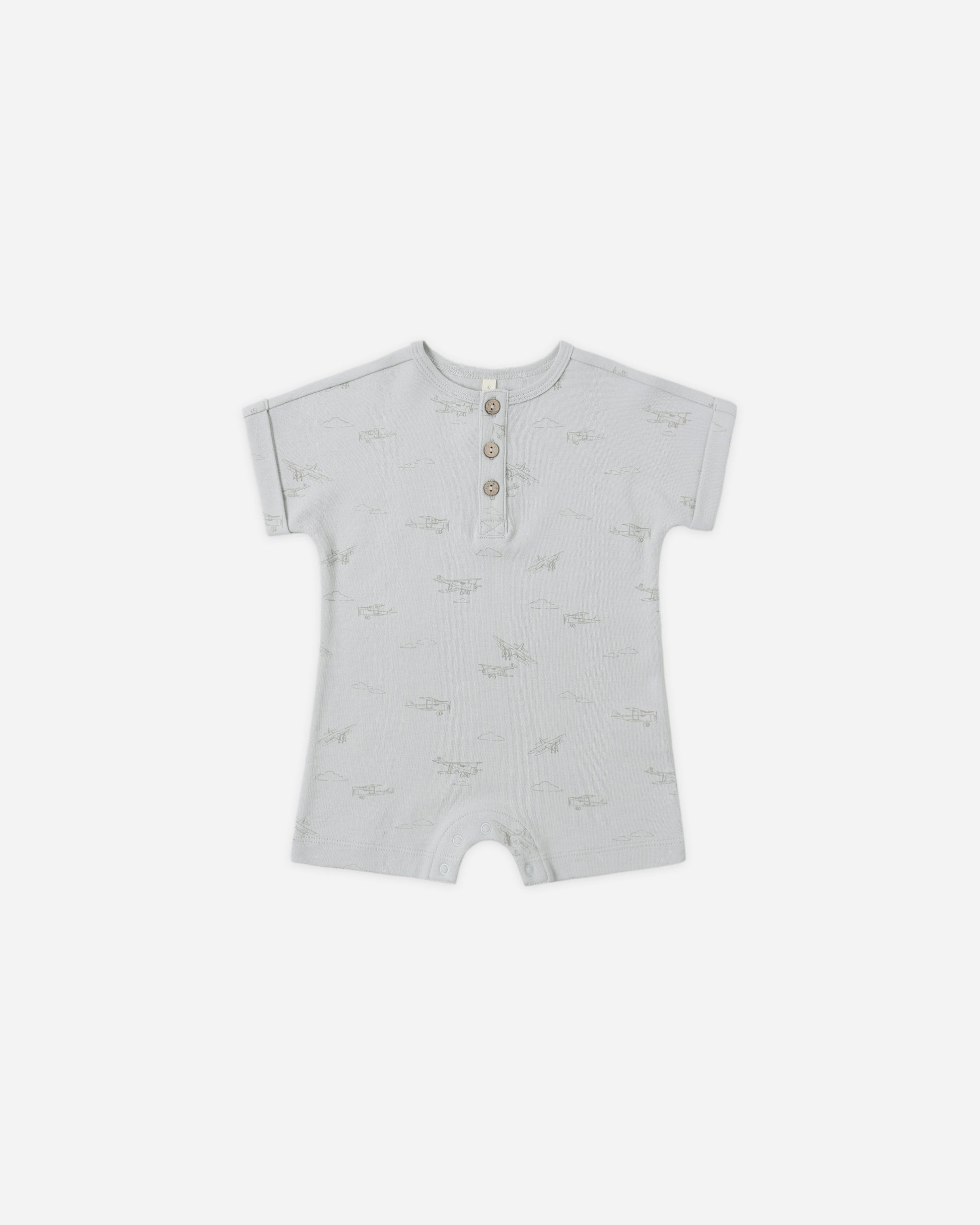 Our short-sleeve romper has folded cuffed sleeves, buttons down the chest, and snaps along inseam for easy changes - the perfect lightweight summer staple!
