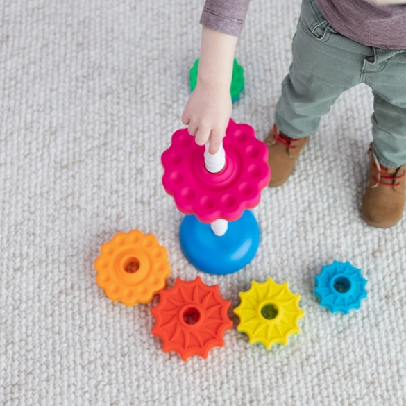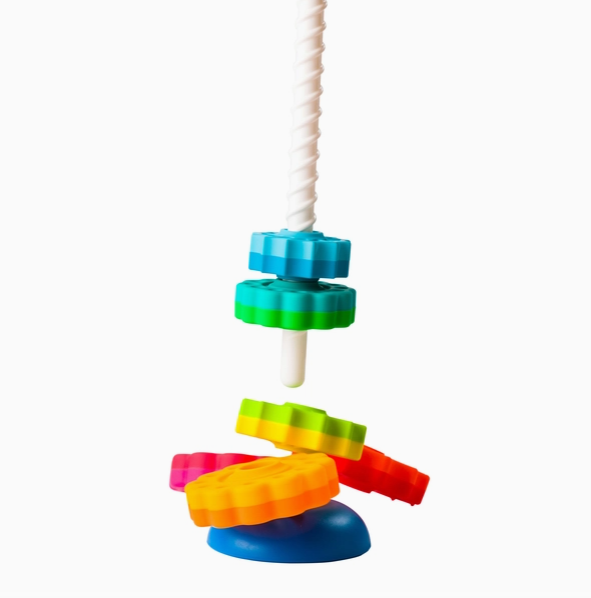 Drop the vibrant discs onto the threaded corkscrew pole and go ooooh as they spin fast and smooth to settle onto the reversible base. Choosing how to set the base is half the fun for your toddler. Pick either the wobble base or turn it over for a solid seat. Each disc is dual-colored, and from largest to smallest, they form a dynamic rainbow utilizing fun shades like magenta, lime, and teal, and your more traditional shades of lemon, red, and sky blue. The star-like discs alternate between daisy style and star-burst shapes, too. Want to make a rainbow? Want to keep all the round-edged shapes separate? You can! Even the smallest disc can spin all the way to the base. Awww, all the discs are in order; what now? Taking the SpinAgain apart so you can start spinning again might just be the best part! Lift up on the easy-to-release central pole and all the discs spin off the bottom!