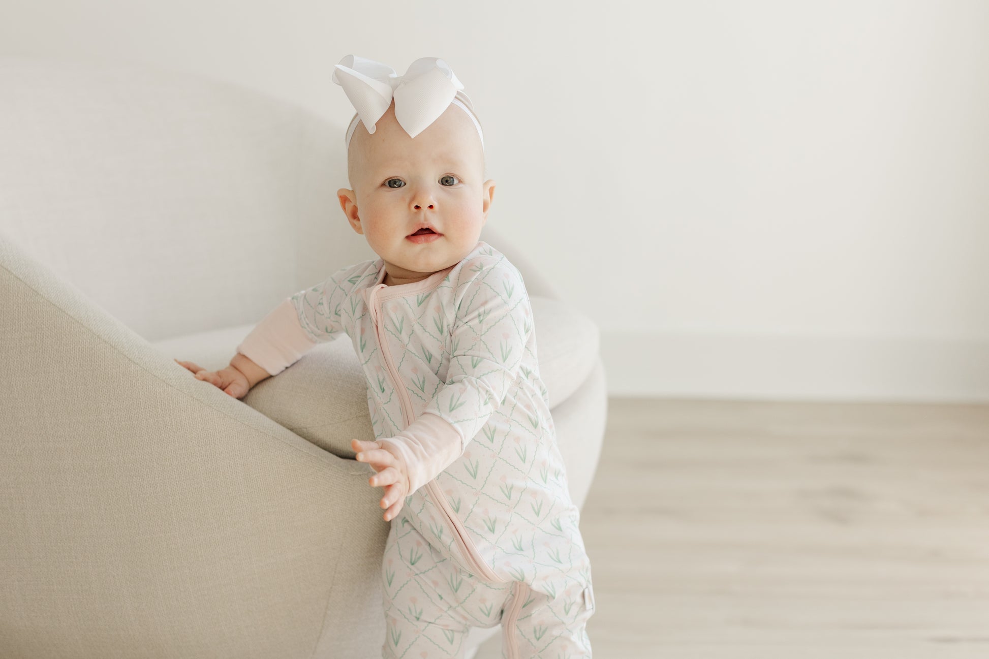 Soft bamboo fabric keeps your little one cozy and comfortable all night long. This adorable zip-up pajama features a charming tulip trellis print perfect for any baby girl's sleepwear collection. The gentle, breathable material is ideal for sensitive skin, while the convenient front zip makes bedtime changes effortless. Sweet dreams guaranteed.