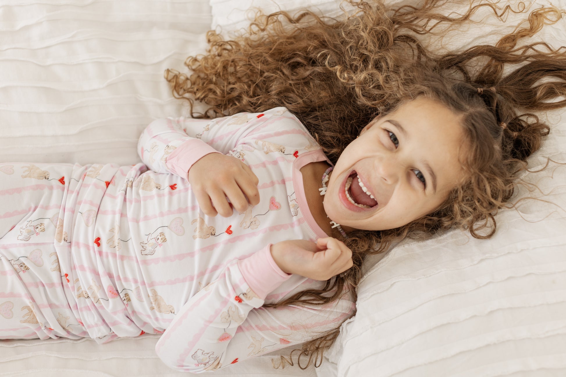 Celebrate Valentine's Day in style with our Valentine Pups Jam Set, crafted from luxuriously soft bamboo fabric that's gentle on delicate skin. This adorable girlie pajama collection features charming pup-themed designs paired with playful jam motifs, perfect for little ones who love cozy nights and sweet style. Bamboo material offers natural breathability and moisture-wicking properties, ensuring comfort throughout the night. The set combines durability with that signature softness kids adore, making it an ideal choice for Valentine's gifting or everyday wear.