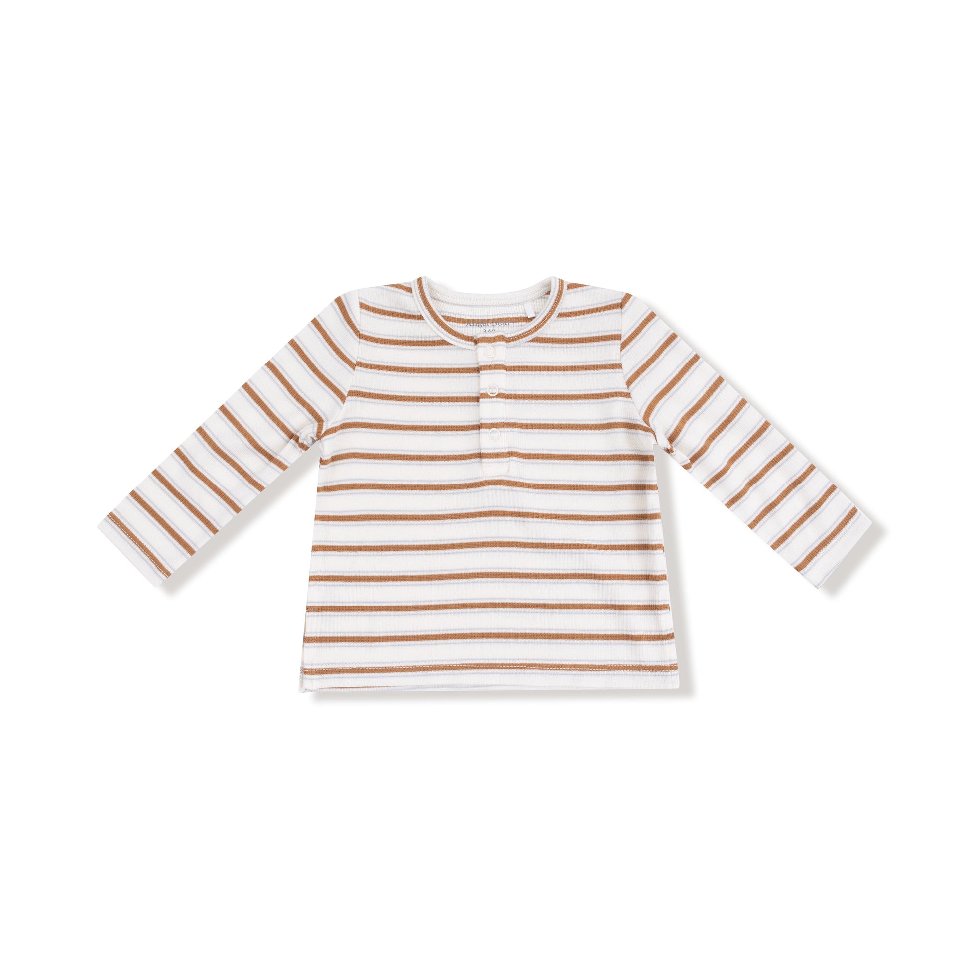 This Vintage Stripe Long-Sleeve Henley features a soft, breathable top perfect for a little boy’s everyday comfort. Crafted with care, its warm brown tones and classic stripe design offer timeless style while ensuring gentle wear on sensitive skin. Ideal for layering or wearing alone, this Henley combines durability with a cozy fit, making it a smart choice for active kids.